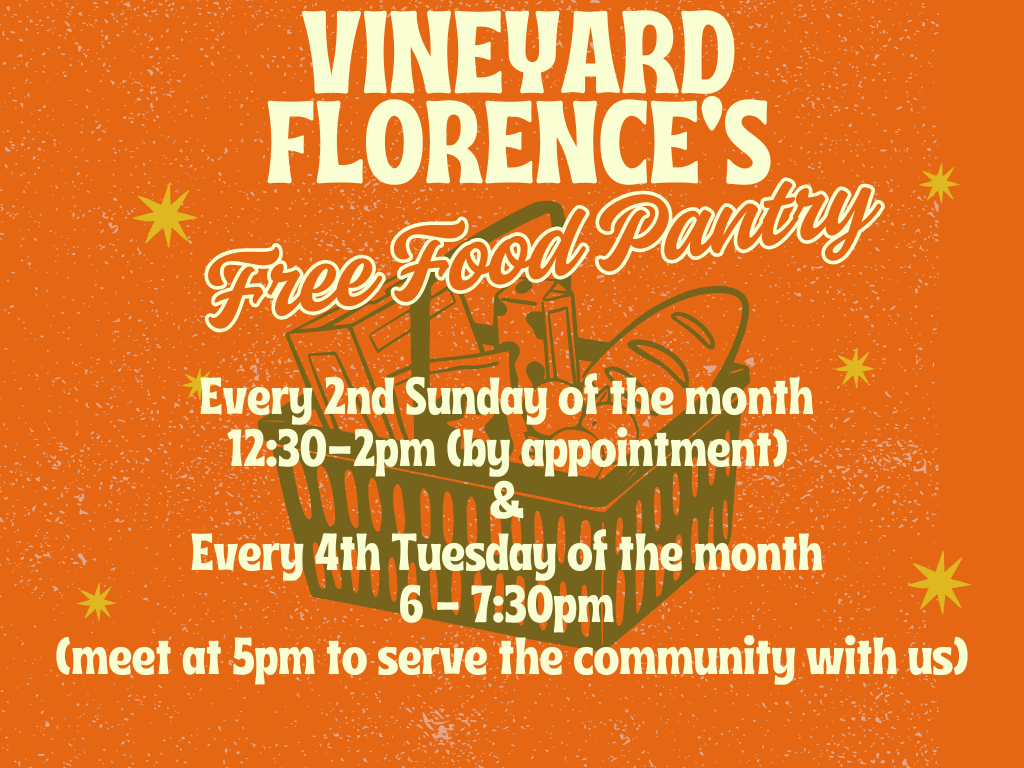 If you or someone you know is in need of groceries, you may come to Vineyard Florence between 6:00 pm - 7:30 pm and get groceries.